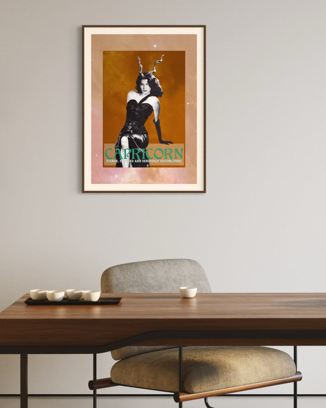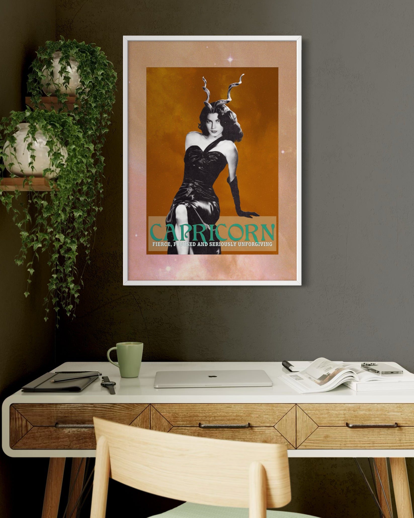 Capricorn vintage styled zodiac print featuring the ultimate Capricorn, Ava Gardner. One of a series of zodiac star sign prints featuring Hollywood stars from the Golden Age of the Silver Screen! Limited Edition of 50 per size, this print has been produced from both hand cut analog collage and digital collage, for the Capricorn in your life (or yourself!). This headstrong and focussed leading lady displays her goat horns proudly. Ava strikes a confident, no-nonsense and independent pose with a reserved and cautious glint in her eye - typical of the ever practical Capricorn.