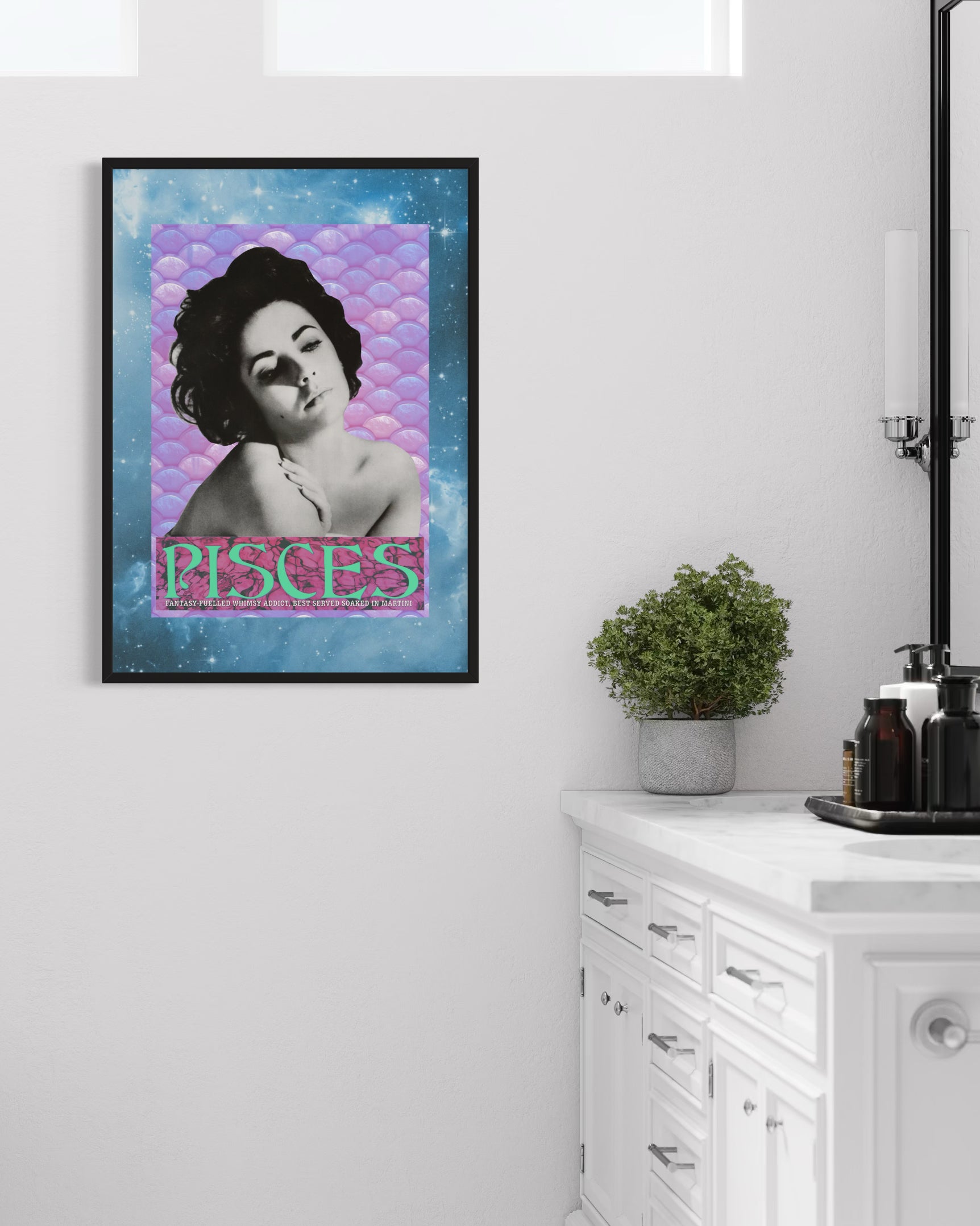 Pisces vintage styled zodiac print featuring the ultimate Pisces, Elizabeth Taylor. One of a series of zodiac star sign prints featuring Hollywood stars from the Golden Age of the Silver Screen! Limited Edition of 50 per size, this print has been produced from both hand cut analog collage and digital collage, for the Pisces in your life (or yourself!). Wonderfully imaginative, Pisces like Liz love to escape real life by indulging in whimsical and artistic endeavours but don't be fooled by their playfulness - they are deeply compassionate and emotional, with a tendency to be incredibly sensitive and they simply love being in love!